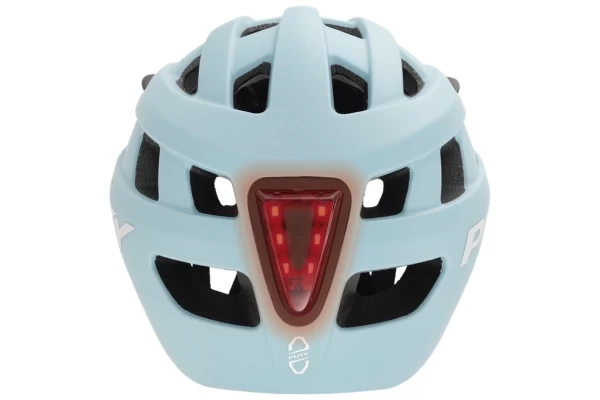 Ein robuster pastelblauer Helm aus Polycarbonat, geeignet für einen Kopfumfang von 48 bis 55 cm. Der praktische Drehknopf ermöglicht eine perfekte Größenanpassung des Helms. Der Helm ist sehr leicht: er wiegt nur 220 Gramm. Er hat 17 Belüftungslöcher mit integriertem Insektenschutz, die den Kopf angenehm kühl halten. Die EPS-Schräge auf der Innenseite fühlt sich angenehm an. Das Licht auf der Rückseite des Helms hat drei Einstellungen (Dauerlicht, Blinklicht und Aus) und ist abnehmbar.